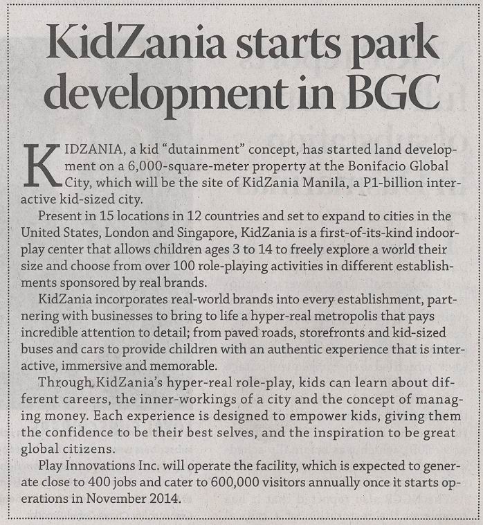 KidZania Starts Park Development in BGC November 28, 2013 · by kidzanianews · in Uncategorized. · Business Mirror – KidZania Manila Related